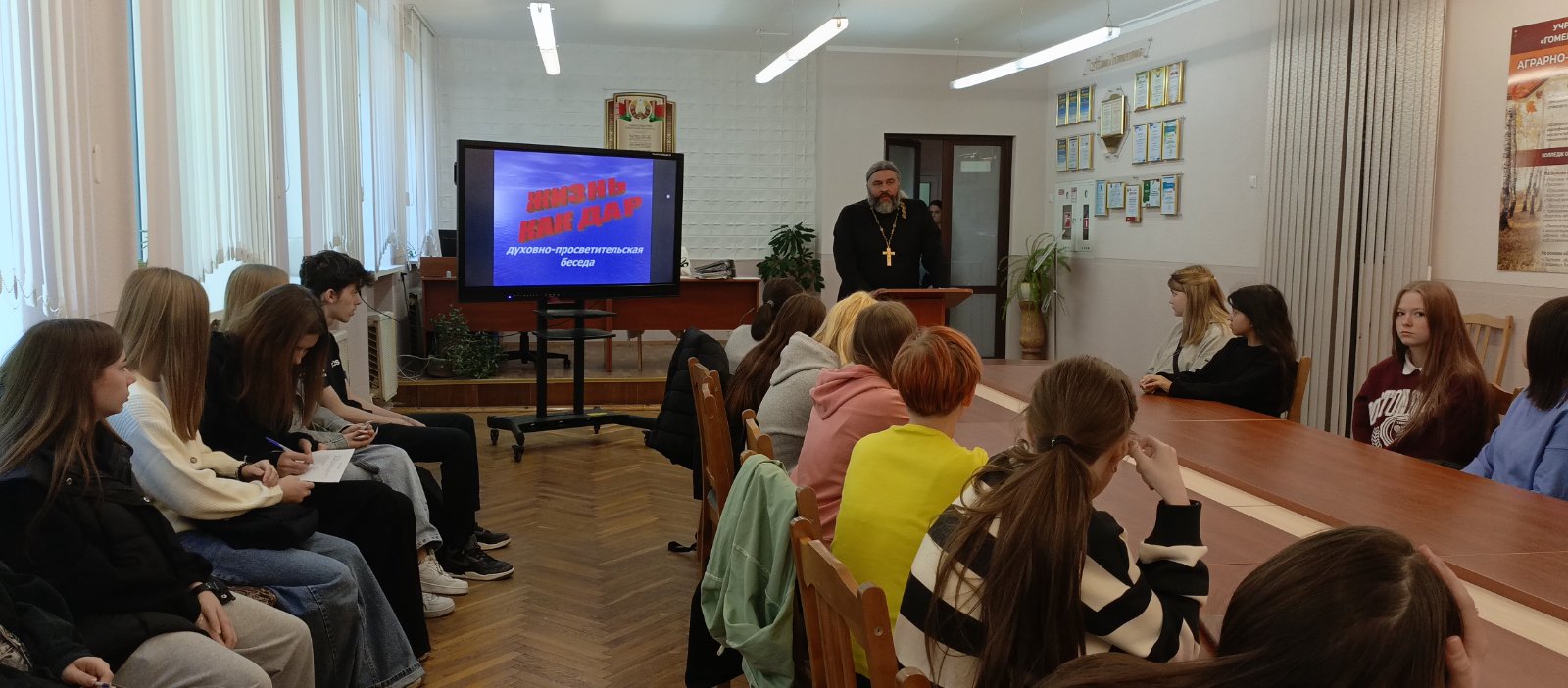 25 сентября рамках месячника по профилактике и предупреждению суицидов среди учащихся «Скажи жизни да!» на базе колледжа состоялась духовно-просветительская беседа «Жизнь как дар» с участием протоиерея Прихода Храма Иверской иконы Божией Матери Андрея Булацкого.