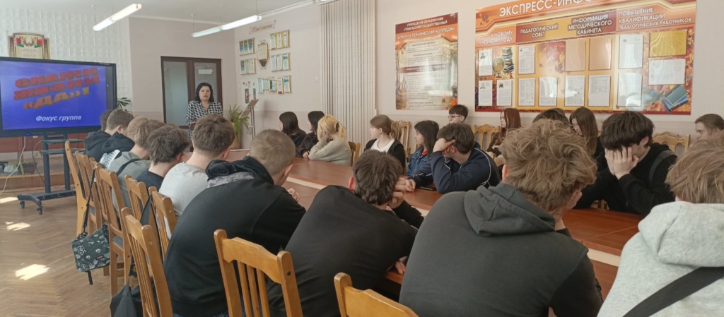 19 марта в рамках месячника по профилактике и предупреждению суицидов среди учащихся «Скажи жизни „да“!» на базе колледжа состоялось профилактическое занятие «Цени свою жизнь, пока ты жив» под руководством психолога ЦСОН Советского района г. Гомеля Гавриловой И. Ф.